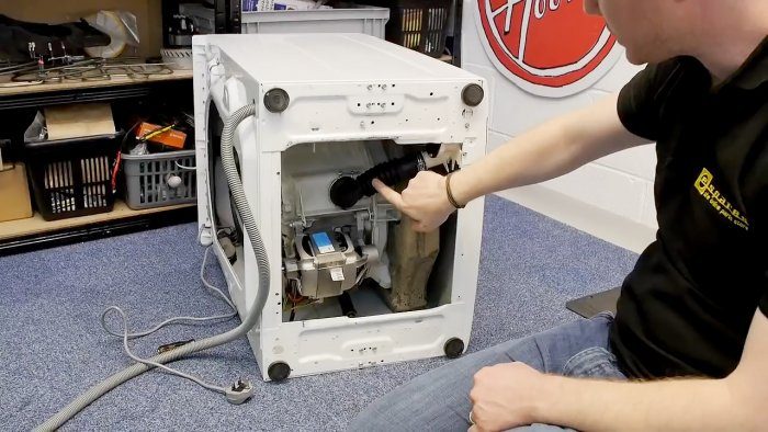Обследовать пространство под барабаном можно и снизу машинки. Она укладывается на бок, после чего снимается ее крышка. За ней находится патрубок, ведущий на сливной насос.