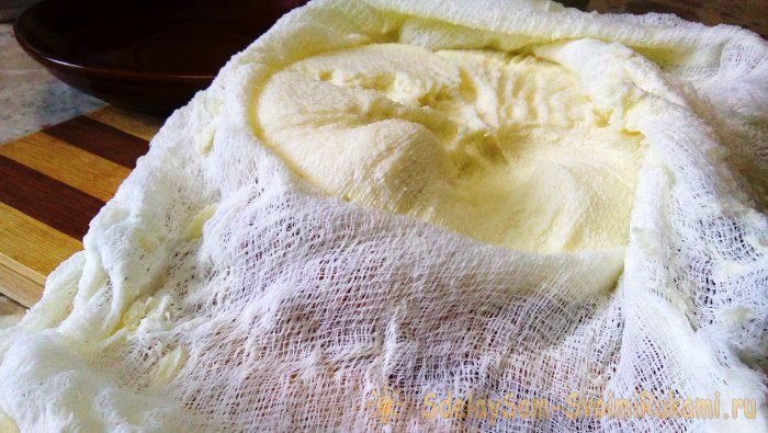 11. Сняв гнет, аккуратно разворачиваем края марли. Вынимаем получившийся продукт и выкладываем на доску.