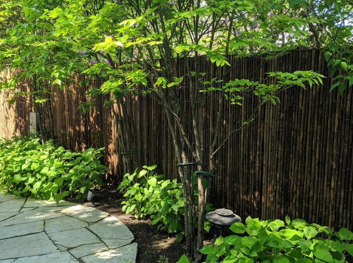 Можно использовать для этого и натуральные материалы, ничего не варить и не пилить. Например, красиво прикроют такой однотонный забор из профнастила маты из бамбука. Их не нужно дополнительно украшать, стоит просто прикрепить, чтобы не упали. Обычно они продаются в виде рулонов, где планки соединены простой проволокой, так что установить их легко.