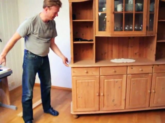 Причем, чем тяжелей мебель, тем больше должно быть точек опор с картофельными прослойками. В этом случае, помимо штатных опорных точек (обычно их четыре), необходимо создать дополнительные. Ими могут временно стать, например, подходящие по высоте и сечению деревянные бруски, подставляемые под силовые элементы шкафа или серванта. Естественно, под них также необходимо подкладывать картофельные кружки.