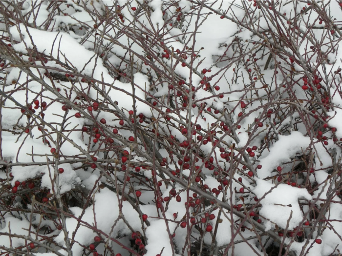 Шиповник тоже может подойти для создания красивой картины зимнего сада. Он не только колючий, но ещё и полезный. Ягоды богаты витаминами, а красивый и яркий внешний вид из-за красных плодов будет радовать глаз и в холодные периоды. Особенно, когда выпадет снег.