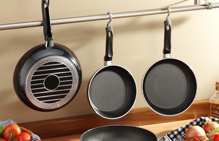 В отличие от чугунной посуды, сковороды с антипригарным покрытием имеют небольшой вес, поскольку практически все изготовлены из алюминия. Их можно хранить на специальной вешалки прямо на стене.