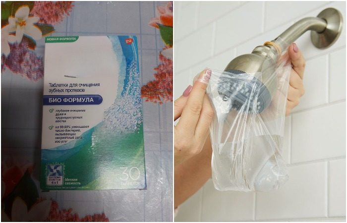 Если вы заметили, что во время приема душа вода льется только из некоторых отверстий в лейке, пришло время ее помыть. Чтобы избавиться от налета, возьмите плотный полиэтиленовый пакет, налейте в него горячую воду, положите одну-две таблетки и поместите лейку в полученный раствор. Крепко зафиксируйте пакет на душевой насадке и оставьте на пару часов. Этого времени хватит для того, чтобы налет и прочие загрязнения растворились.