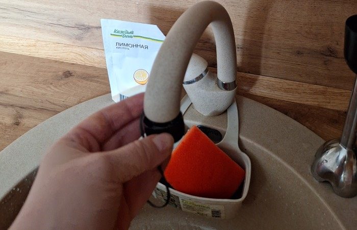 Для начала необходимо сделать раствор из лимонной кислоты и воды. После чего возьмите любую бутылку и снимите с нее крышечку. Именно она нам и понадобится. В нее следует налить наш раствор и надеть ее на кран. Чтобы она лучше держалась, закрепите ее резинкой. Через полчаса просто снимите ее и пропустите горячую воду сильным напором. Это позволит тщательно почистить сеточку на вашем кране, что поможет вам использовать нужный напор воды без проблем.