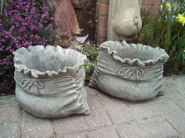 Одни из наиболее популярных садовых скульптур — это кашпо и горшки. Они будут не только функциональны, но и украсят весь сад. Чтобы создать такие горшки, понадобятся две формы: одна большая и одна маленькая, чтобы создать пустоту внутри горшка. Либо можно воспользоваться каркасным методом. После приготовлении смеси можно приступать к заполнению формы. Важно убедиться, что маленькая форма при этом не будет касаться дна, так получится равномерная и необходимая толщина стенок. Сушиться такое изделие должно не менее двадцати четырёх часов. Форму также необходимо извлекать крайне аккуратно, чтобы не разрушить скульптуру, если она ещё не до конца схватилась.