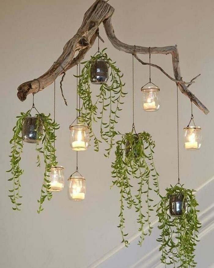 Красивый кусок дерева, несколько банок, электрические свечи и суккулентные растения создают уникальную и прекрасную «люстру»