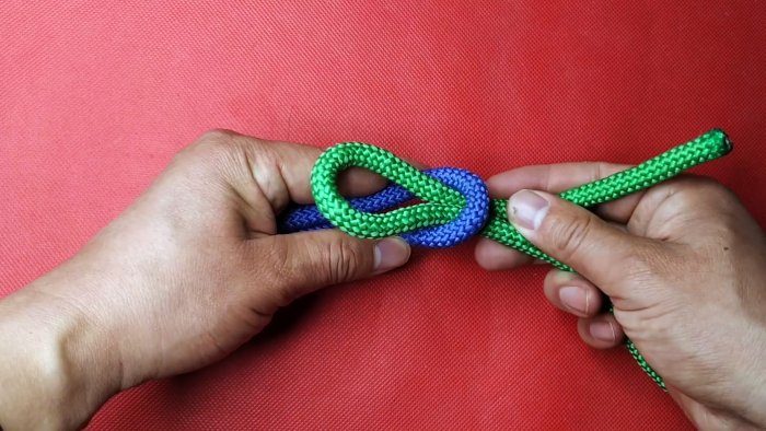 После этого короткие края нужно просто завязать в простой узел. Потянув за длинные концы можно окончательно затянуть веревки, закончив сращивание. Под нагрузкой такой узел не уплотнится сильно, поэтому его можно будет развязать.