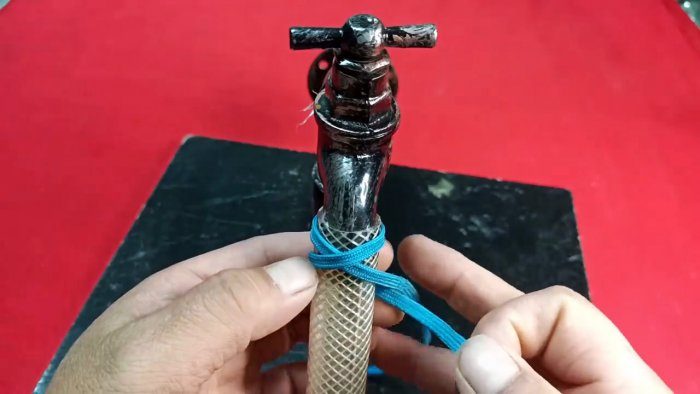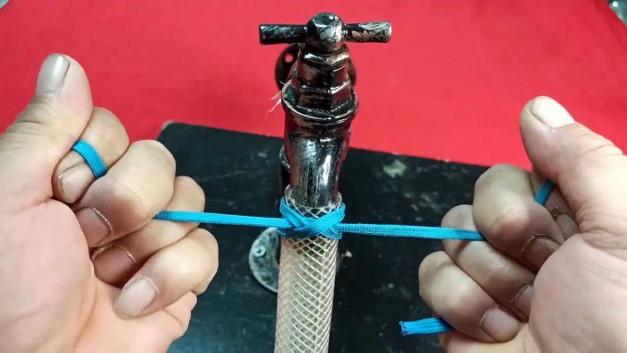 Если нужно затянуть шланг на штуцере или смесителе, то необходимо обернуть вокруг него тонкий шнурок. Затем один край обводится за шлангом под вторым хвостом шнурка.