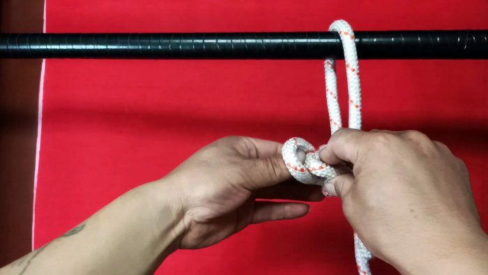 Один край веревки складывается пополам. На образовавшейся петле нужно сделать полный оборот вторым концом. Затем он протягивается в собственное образованное от оборота кольцо.