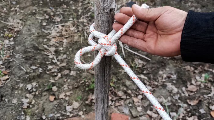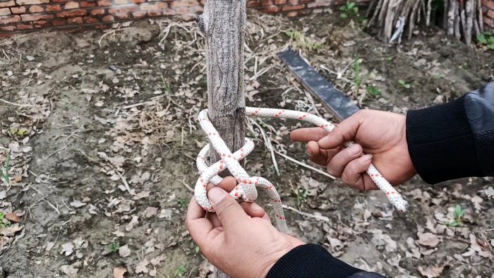 Веревка складывается пополам. Ее петля обводится вокруг столба или вбитого кола, который нужно вырвать из земли. Через нее пропускаются сложенные концы 2 раза, после чего она затягивается.