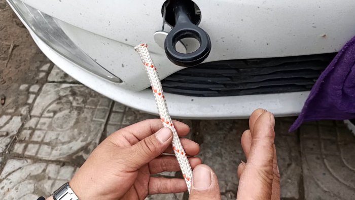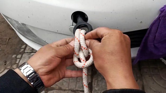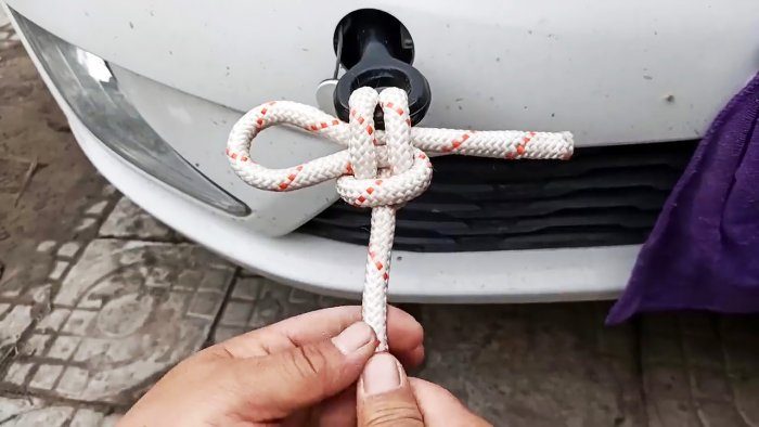 Этот узел поможет, когда будет выполняться сильное натяжение, к примеру, при буксировке. Веревка запускается в проушину или перекладину снизу. Затем короткий край обводится за длинный, и вводится снова, но уже сверху.