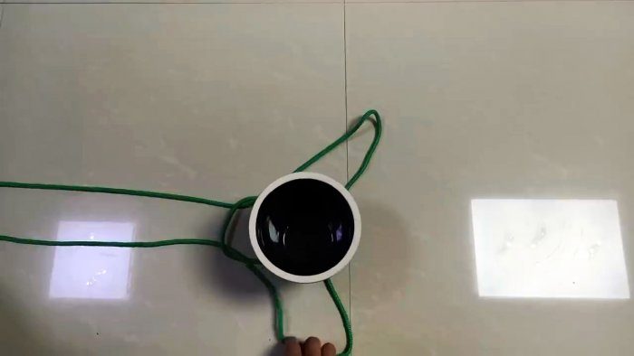 Центральная петля перекидывается через горшок и меньшие петли. Ее нужно подвести под них. Затем остается захватить ее через малые петли и потянуть вверх. В результате веревка охватит горшок и получится 2 ручки.