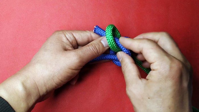 Края веревок складываются вдвое. Одна петля вводится в другую. Короткий край от внутренней веревки пропускается через собственное кольцо.