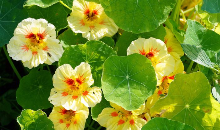 Цветок не просто очень красивый, но и очень помогает отпугивать тлю и гусениц. А сами цветы и листья даже съедобны. Рядом с капустой настурция отпугнёт белянку, а если расположить клумбу на входе в теплицу, то можно не беспокоиться, что белокрылка повредит растущие там помидоры. Она отлично растёт рядом с капризными пионами и помогает им избежать развития грибка, который часто становится причиной болезни этих цветов. Её также можно высадить рядом с вишнями и абрикосами. Она не просто защитит их, но и станет естественным удобрением, особенно если осенью закопать её в приствольные круги деревьев. Когда происходит посадка картофеля, траншеи можно заполнить цветами и листьями настурции. Они помогут избавиться от грибка.