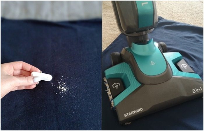 Итак, измельчите мел до состояния крошки, равномерным слоем распределите его по загрязненному участку одежды и оставьте на несколько часов, чтобы он впитал в себя большую часть жира. После этого удалите остатки мела влажной тряпкой и переходите ко второму этапу. Установите на пылесос насадку для отпаривания ковров и включите режим паровой уборки. Обрабатывайте одежду около десяти минут, пока жирное пятно полностью не исчезнет. Конечно, этот способ не такой быстрый, как хотелось бы, зато очень эффективный – не придется раз за разом пытаться отстирать одежду в стиральной машине.