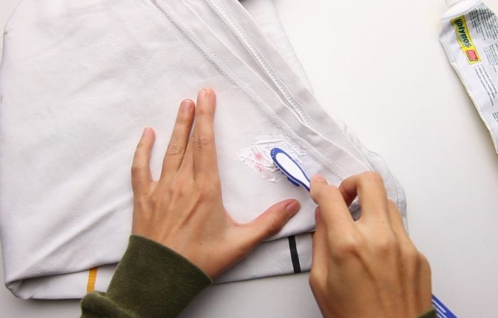 Данный метод и средство работает исключительно на свежих пятнах. Испачканный участок смачивается тёплой водой, поверх него с помощью щётки наносится небольшое количество зубной пасты или порошка. Средство хорошенько втирается мягкими круговыми движениями и остаётся в таком виде до сорока минут. Дальше одежда выполаскивается и стирается привычным способом. Важно! пасту нужно брать белую и без отбеливающего эффекта.
