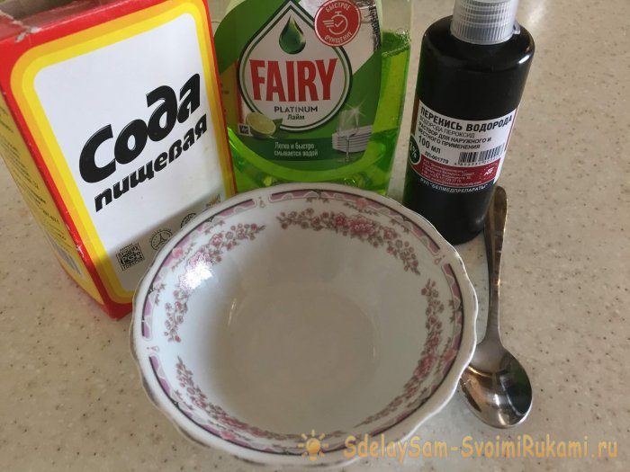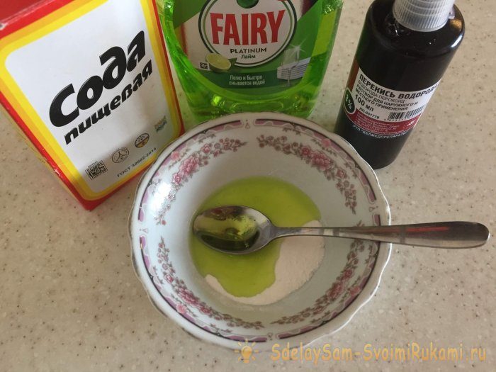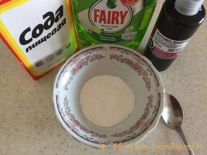 Способ 1. Аптечная перекись водорода + сода + жидкость для мытья посуды.