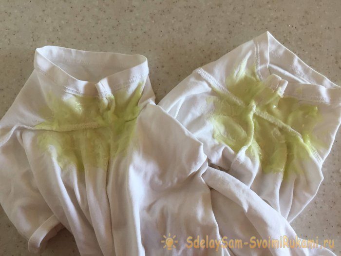 Полученную кашицу разложить на участках ткани со следами пота и полить сверху перекисью водорода.