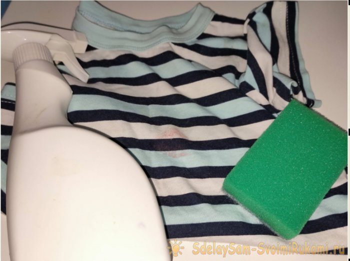 Я беру испачканную футболку и слегка смачиваю пятно. Для этого хорошо подойдёт распылитель или обычная новая губка для мытья посуды.