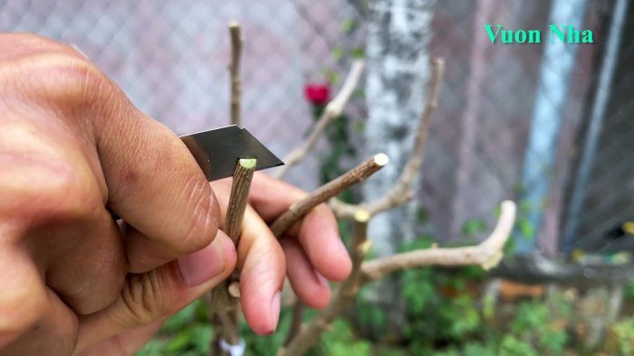 Процесс прививки одного куста разноцветными цветами