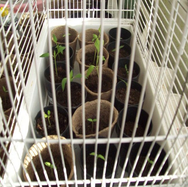 Также для защиты от повреждения саженцев котом поможет старя клетка. Это может быть клетка от птиц, кроликов или хомяков, главное чтобы внутрь смог поместиться контейнер или горшок с рассадой, чтобы им было куда расти ввысь. А циркуляция воздуха и доступ света будут обеспечены. И хотя это менее эстетический способ, очень действенный. В целом можно соорудить подобную клетку самому из тонкой проволоки, нужно лишь надёжно скрепить между собой все углы, чтобы домашний питомец не поломал её. Для этого подойдут металлические уголки или рейки, а также строительные хомуты. Если делать клетку самому, то лучше соорудить её сразу без дна, чтобы было легче поднимать, во время полива и ухода за растениями.