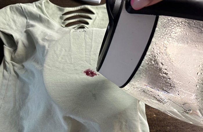 К счастью, есть эффективный способ, который поможет справиться с проблемой – нужно лишь залить пятна кипятком. Ягодный сок содержит водорастворимые пигменты, которые легко разрушаются под влиянием высоком температуры. Когда вы заливаете вещь кипятком, он растворяет эти пигменты и выводит их из ткани. Важно лишь, чтобы пятна были свежими – с застарелыми горячая вода не справится.