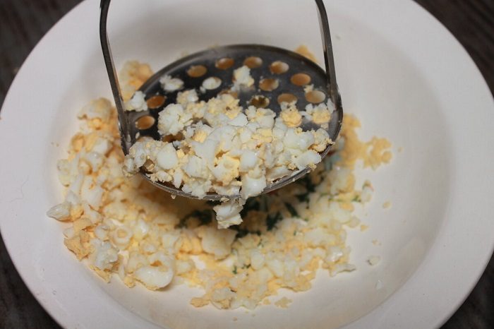 Праздничный стол – это всегда большое количество салатов, и практически все из них содержат в своем составе яйца. Чтобы не измельчать каждое по отдельности, сложите все яйца в большую миску или кастрюлю и измельчите толкушкой для пюре. Минута – и вот уже все готово!