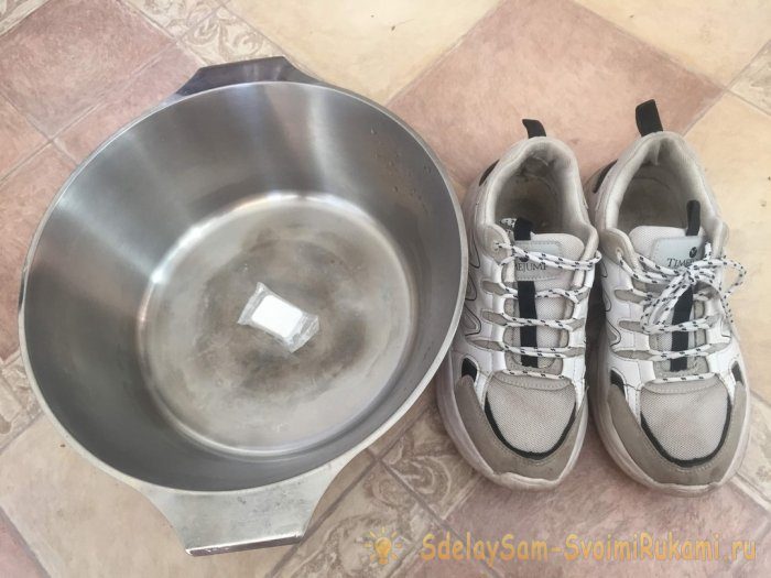 Опустить кроссовки в таз, полностью погрузив в жидкость все текстильные элементы (верхнюю часть обуви, стельки, шнурки). Сюда же можно положить грязные белые носки. Если кроссовки всплывают – прижать их прессом.