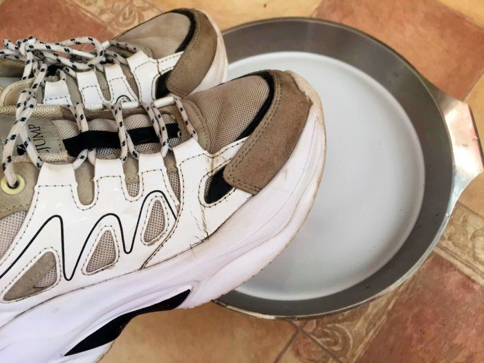 3. Опустить кроссовки в таз, полностью погрузив в жидкость все текстильные элементы (верхнюю часть обуви, стельки, шнурки). Сюда же можно положить грязные белые носки. Если кроссовки всплывают – прижать их прессом.