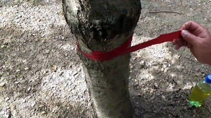 Из хорошо впитывающей мягкой ветоши необходимо изготовить ленту, пропитать ее в подсолнечном масле, и завязать на крону дерева.