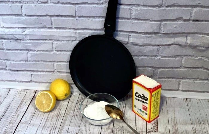 Для начала разрежьте лимон пополам, после чего половинку лимона обильно посыпьте обыкновенной содой. Именно этой половинкой лимона и следует оттирать нагар со сковороды. Вы удивитесь, но это средство работает безотказно. Всего за пару минут весь нагар отойдет от вашей посуды, и она засияет чистотой.