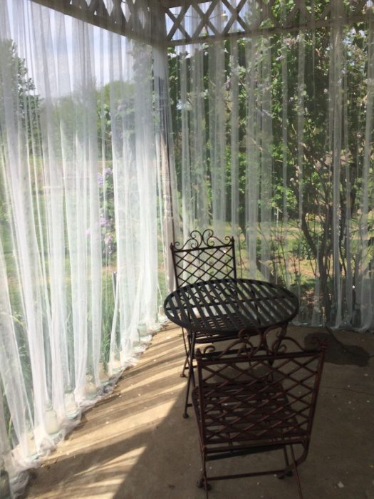 В беседках тюль в пол будет смотреться особенно красиво и, кроме практического применения, будет служить ещё и в эстетическом аспекте. Она сделает пространство более высоким, воздушным и светлым. К тому же тюль, как и в случае с грядками, способна удерживать больше тепла в помещении, которое окружает.