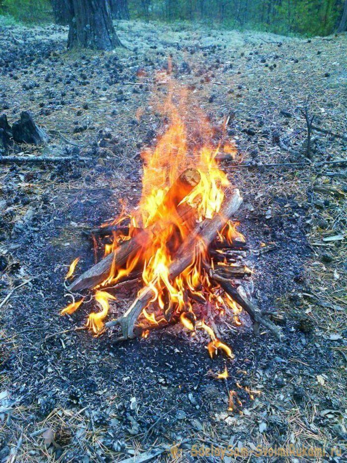 Да, и ещё один немаловажный момент: для того, чтобы искра лучше занялась на труте, можно этот трут потереть об обугленную поверхность. Например, об опаленное молнией дерево. Или на месте пожарища. А еще лучше соскрести ножом небольшое количество угольного порошка и стружки на трут.