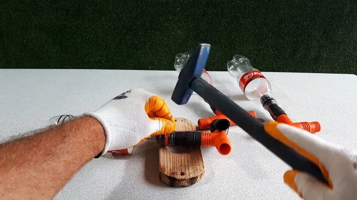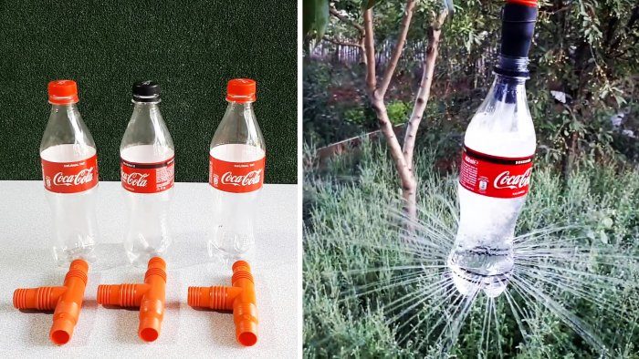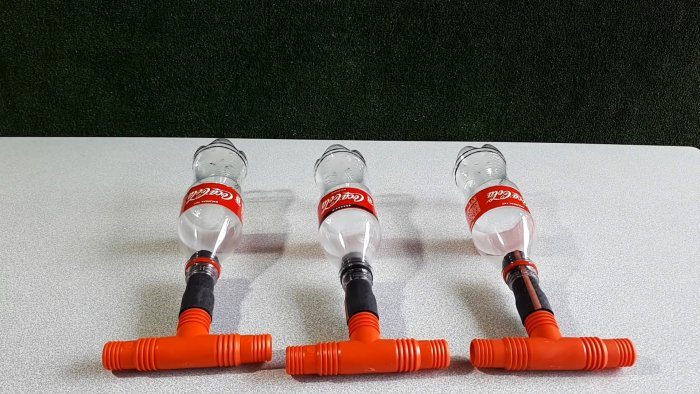 Затем в их горлышки плотно вставляют отрезки садового шланга длиной по 10-15 см. Свободные концы трубок натягиваются на тройники.