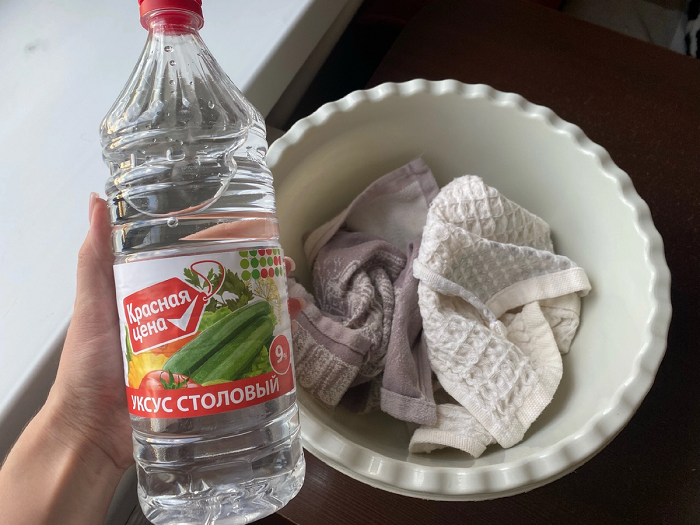 Все, что вам нужно сделать, смешать в миске теплую воду со 100 миллилитрами белого уксуса, замочить в полученном растворе полотенца и оставить их примерно на 30 минут. По истечении времени достаньте изделия, насыпьте в миску 50 граммов соды, хорошо размешайте и снова погрузите полотенца в воду. Если смесь начнет шипеть – не пугайтесь, просто сода вступила в реакцию с уксусной кислотой.
