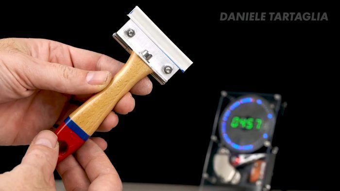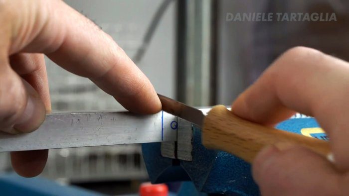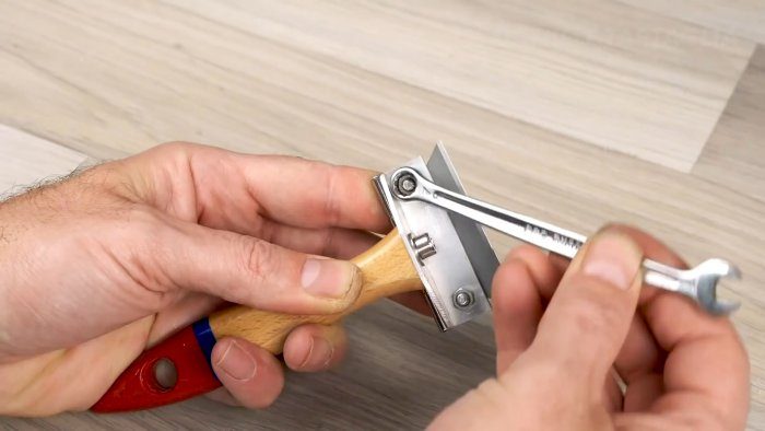 К уголку на ручке прикручивается дверная петля. Перед зажатием в нее вставляется трапециевидное лезвие.
