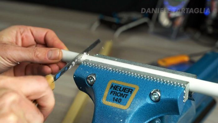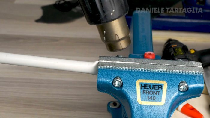 Чтобы им не порезаться, нужно сделать чехол на лезвие. Для этого требуется разогреть пластиковую трубу, и сжать ее в тисках.