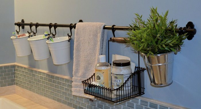Обычно рейлинги используют для хранения на кухне, но кто сказал, что он не пригодится вам в ванной комнате? Главный плюс такого изделия состоит в том, что на него можно подвесить практически любые вещи, например, мочалки.