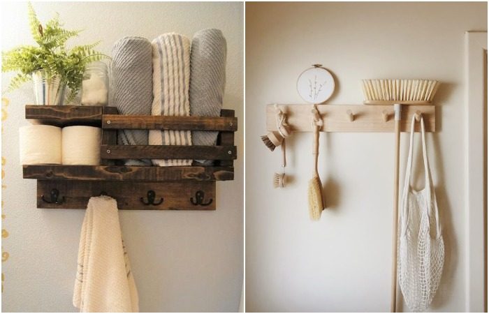 Крючки в ванной – полезный и удобный вариант хранения. На них можно повесить полотенца, халаты и прочие вещи, у которых есть петелька. А чтобы крючки были не только функциональными, но еще и красивыми, выбирайте деревянные изделия на планке – они выглядят очень эстетично. Важно, чтобы они были влагостойкими, иначе через пару месяцев в ванной дерево просто разбухнет. Если же нужно будет где-то разместить мелочи, сложите их в авоськи или подвесные корзины, как в предыдущем пункте, и тоже расположите на крючках.