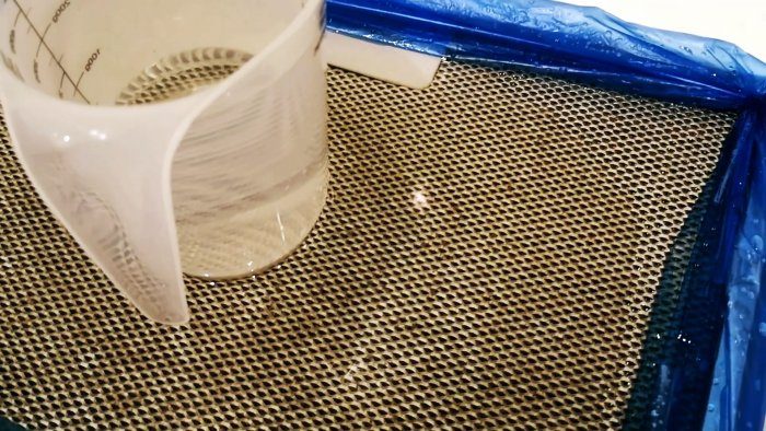 Изначально требуется найти емкость под решетку, типа протвеня. Если данной емкости у вас нет, возьмите обычный мешок для мусора.