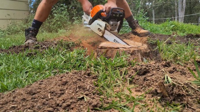 Первое, что надо сделать – это постараться отрезать надземную часть пня, как можно ниже к грунту. В идеале – на уровне с ним.Далее раскапываем землю вокруг пня, во-первых, для того, чтобы была возможность безопасно и без повреждений поработать бензопилой, во-вторых, обнаружить основные корневые ответвления, которых обычно бывает 4 или 5.