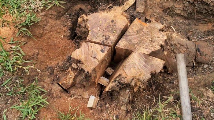 Комбинируя клинья, вбиваем их между двумя четвертинками пня до тех пор, пока одна из них или даже две не сломаются и не отделятся от основного или боковых корней. Мы это поймем по характерному треску, свойственному перелому волокон древесины.