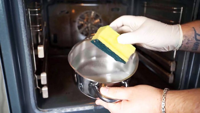 Либо, есть вариант быстрее: закрыть дверцу и включить духовку на 70-90 градусов Цельсия на 30-60 минут. Кастрюлю с раствором нужно поставить туда же. Но учтите, что долгое замачивание дает все же лучший результат.