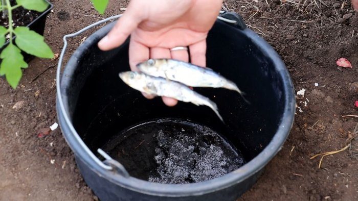 В ведро бросается пара горстей древесной золы и несколько мелких рыбешек. Они послужат хорошим удобрением для томатов. Если почва бедная, то этого будет мало, и нужно будет внести компост или перегной.