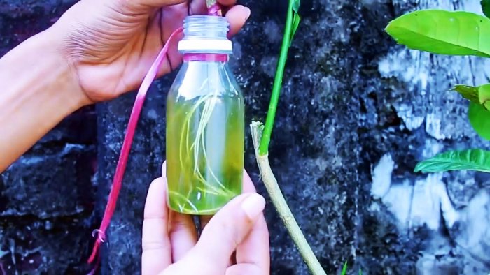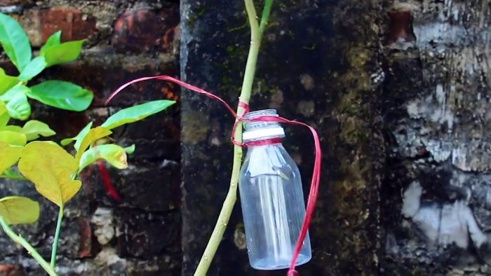 Этот лоскут окунается в горлышко пластиковой бутылки наполненной водой, и она привязывается к ветке. Примерно за месяц из щепки прорастет корешок. Чтобы он не погиб, воду следует доливать.