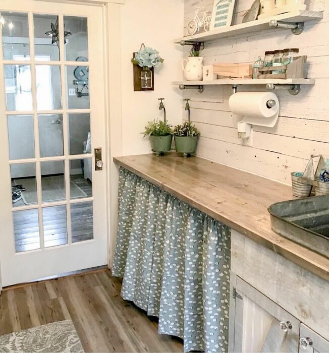 Тканей на даче всегда в избытке, а вот, что сделать с ними и куда применить — идей нет. Со временем они тоже приходят в негодность, даже если лежат сложенными в сухом и проветриваемом шкафу. Материал начинает желтеть или просто истлевают. Но некоторым небольшим отрезам тканей можно найти интересное и вполне современное применение. Многие дизайнеры интерьеров вернулись к идее оформления кухонного гарнитура. Это добавляет лёгкости, интересных акцентных нот на всю кухню — использование шторки вместо дверок шкафчиков. К тому же, благодаря использованию такой шторки можно заменить уже устаревший дизайн всего гарнитура, его не придётся выбрасывать. Стоит просто снять дверцы в тех местах, где они пришли в негодность, и повесить вместо них раздвигающиеся тканевые шторки.