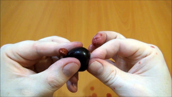 А удалить косточку несложно. Просто вставляем ее в плод и косточка выходит с другой стороны.