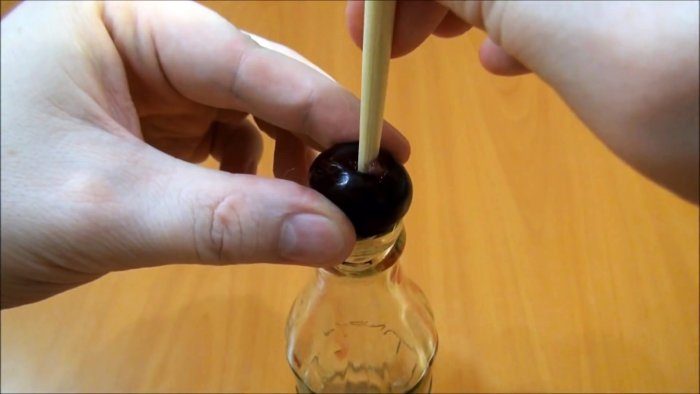 Берем бутылку от напитка или другой сосуд с узким горлышком. Кладем сверху вишню и палочкой просто выдавливаем косточку в сосуд.