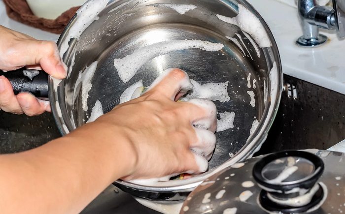 Если в процессе готовки появляются приборы, которыми вы пользуетесь несколько раз, например, венчик, лопатка или щипцы, после каждого использования их нужно класть в миску с теплой водой с добавлением моющего средства. Когда вам снова понадобится девайс, просто ополосните его под проточной водой. Это сильно облегчает жизнь на кухне, так как не приходится вымазывать много приборов сразу, плюс они не «засыхают», пока лежат на столе, и потом не нужно тереть их металлическим скребком.