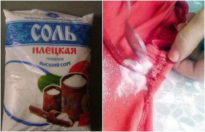 Чтобы убрать пятна пота на одежде, можно сделать крепкий солевой раствор. Для этого растворите в стакане теплой воды три столовых ложки соли, перелейте жидкость в пульверизатор, обработайте загрязненные участки и оставьте на пару часов. Такой способ подойдет, если запах не слишком заметен. Если же он сильно въелся, поступите по-другому. Сначала постирайте одежду в стиральной машине, а затем замочите в горячей соленой воде (на полтора литра воды нужно четыре столовых ложки соли. Через 40 минут прополощите вещи и оставьте сушиться на улице или на балконе.